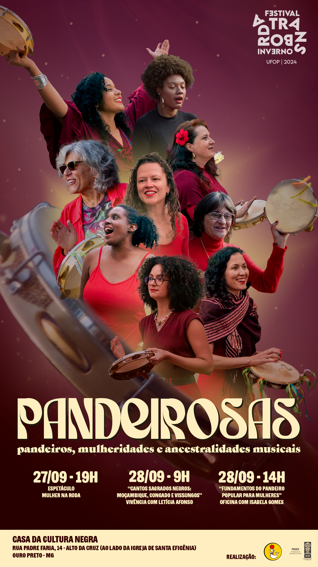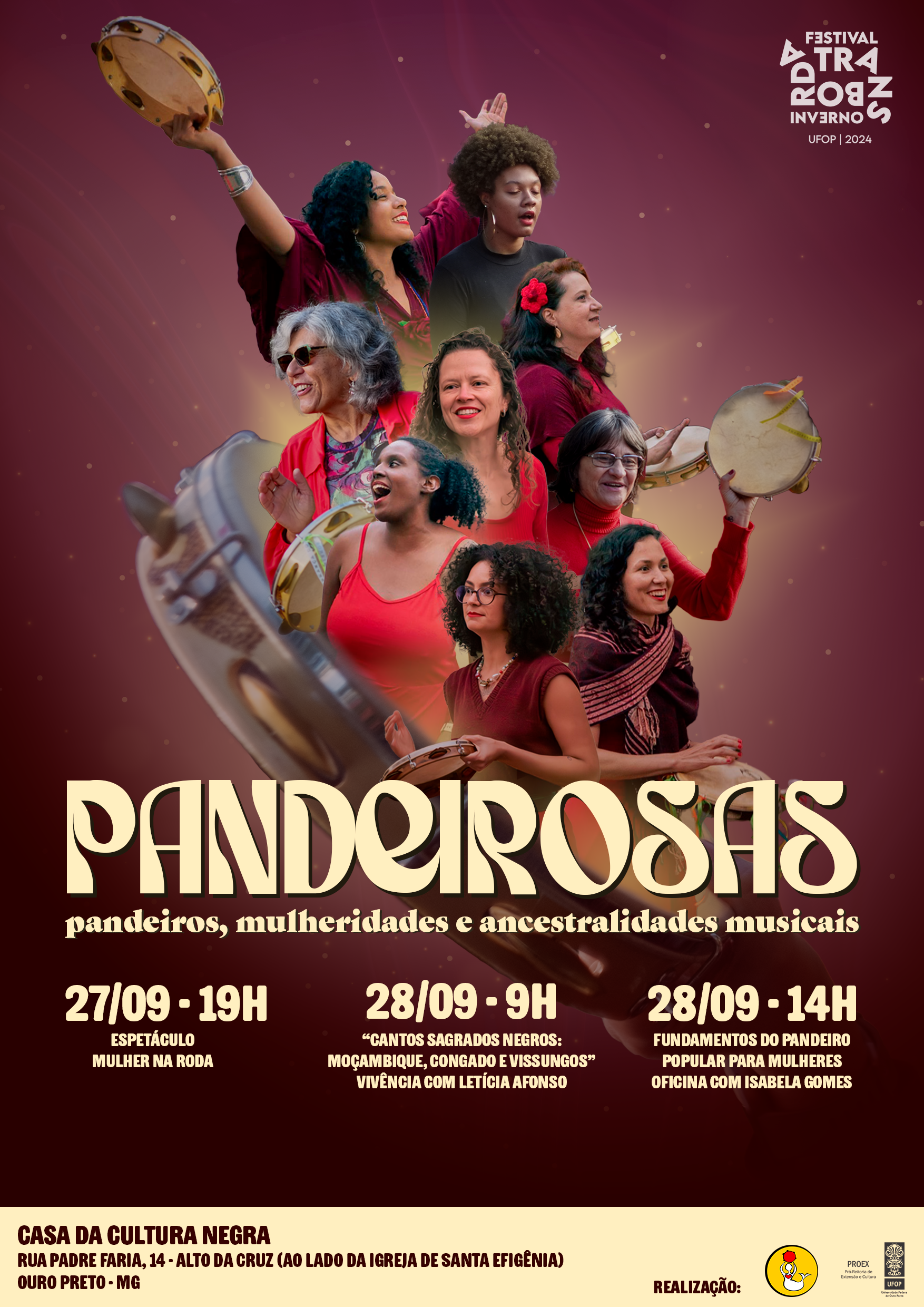 Para o coletivo Pandeirosas, de Ouro Preto-MG, produzi peças de divulgação e fiz a cobertura fotográfica dos eventos que fizeram parte do Festival Transborda Inverno 2024, da UFOP.